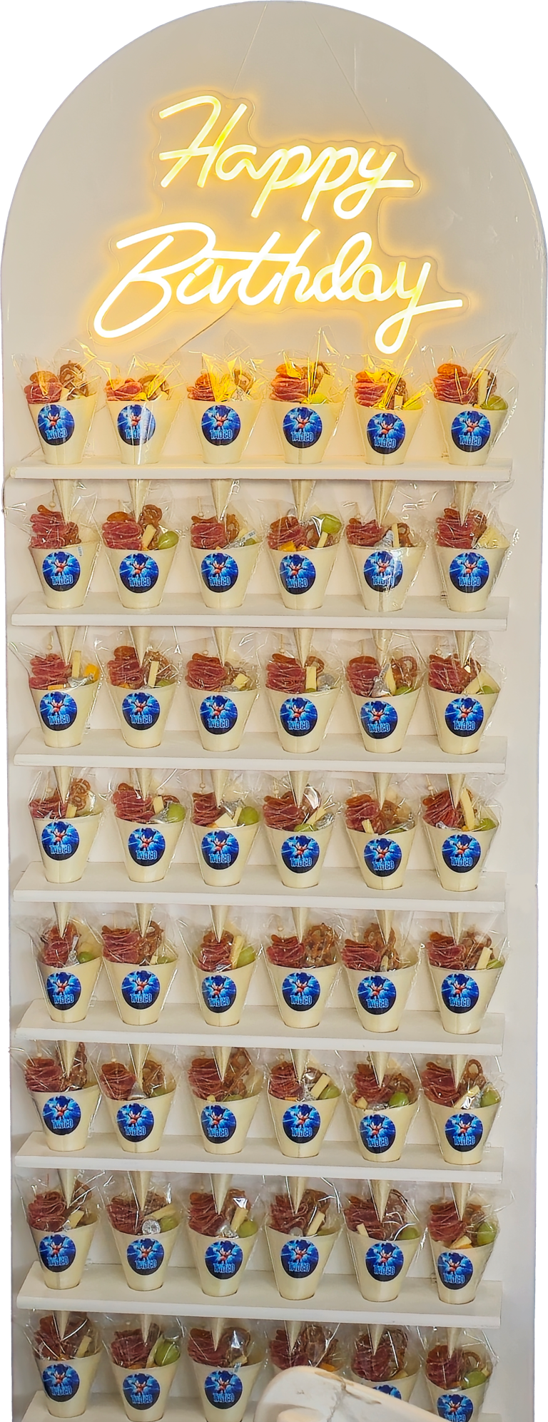Un detalle elegante y práctico: quesos y carnes en cono premium listos para disfrutar.